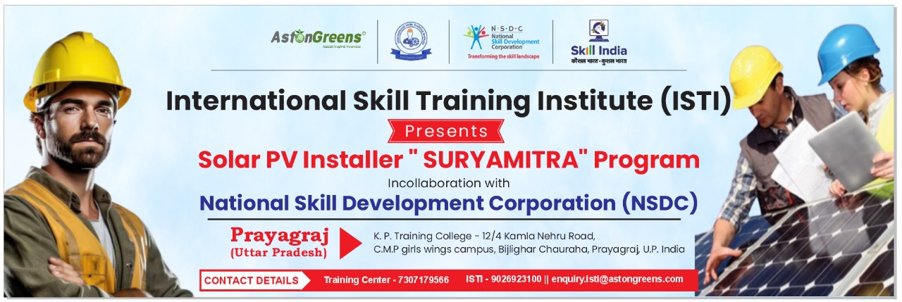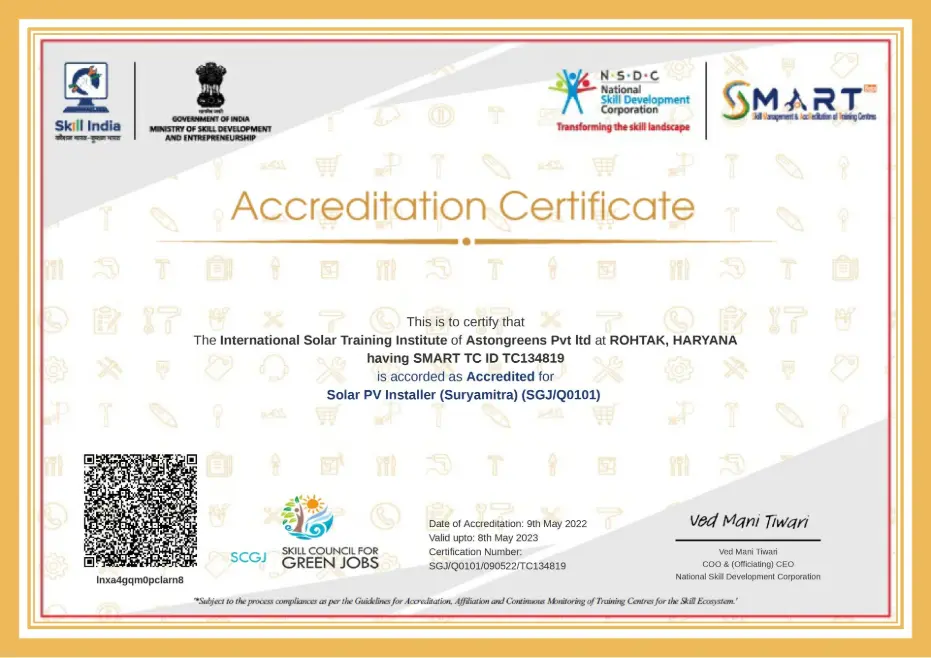 We are proud to announce that the International Solar Training Institute of Astongreens Pvt. Ltd., located in Rohtak, Haryana, has been officially accredited by the National Skill Development Corporation (NSDC).